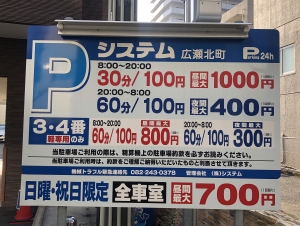 【3・4番(軽専用のみ)8:00~20:00/60分・100円昼間最大800円(1回限り)】